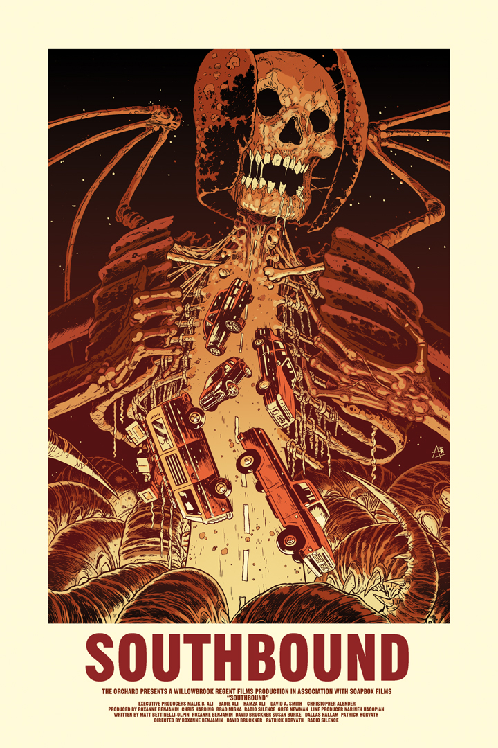 Periodo meraviglioso per gli horror a episodi, questo, non trovate? Ne stanno uscendo parecchi e tutti di qualità medio-alta. A riportare in auge una tipologia di film che sembrava morta e sepolta negli anni ’80, ci hanno pensato quelli di Bloody-Disgusting, quando hanno affidato a un gruppo di registi indipendenti quella che sarebbe poi diventata la fortunata saga di V/H/S. A prescindere dai risultati, a mio parere molto altalenanti. è indubbio che l’horror episodi sia tornato in auge proprio sulla scia di V/H/S, ma, partendo da lì, si è sviluppato ed evoluto in nuove direzioni, abbandonando la trappola del found footage e prediligendo narrazioni meno amatoriali. In Southbound, ultimo della nidiata (ma ce ne sono altri da vedere e altri ancora ne stanno arrivando), ritroviamo alcuni dei personaggi che stavano già dietro il progetto V/H/S, come il collettivo Radio Silence, David Bruckner e Roxanne Benjamin, che lì era attrice e qui firma il suo esordio dietro la macchina da presa dirigendo il secondo segmento del mucchio.