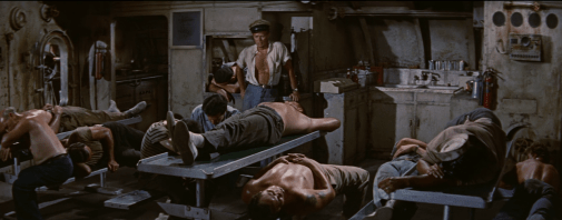 Prendiamo, per esempio, la storia d’amore che deve essere una sorta di pedaggio da pagare per dare al pubblico qualcosa su cui sognare: Fuller la inserisce, si vede che non gli va per niente, ma ottempera agli obblighi contrattuali. Però gira l’unica scena d’amore in tutto il film durante un duello ad alta profondità con un altro sottomarino cinese, con i nostri acquattati in silenzio sul fondo dell’oceano, mentre l’aria sta finendo e l’unica illuminazione è quella rossa, quasi che quel bacio sia più un evento dettato dalla disperazione che da un sentimento reale. È forse la sequenza più bella del film, che alterna il rimpiattino tra sommergibili all’esterno, inquadrature sull’equipaggio esausto e boccheggiante all’interno e, a un certo punto, ha questo improvviso e inaspettato inserto romantico, intorno al quale ogni cosa sembra andare in sospensione. Davvero splendido.