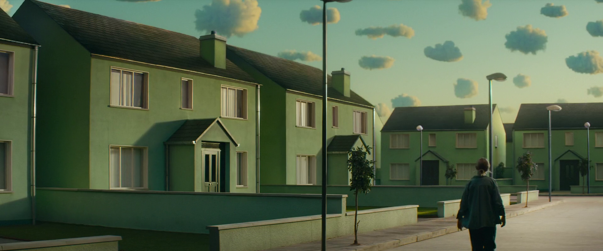 Ci sono tanti dettagli agghiaccianti, in Vivarium: Tom che si scava la fossa da solo (metaforicamente e non), il cibo senza sapore, l’aria priva di odore, l’assenza di condizioni atmosferiche differenti da quelle di una giornata primaverile col sole. Niente pioggia, niente vento, le nuvole che hanno tutte la stessa forma e sembrano appiccicate al cielo come nelle scenografie di un teatro di posa.