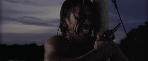 Pensavo che questo film fosse la dimostrazione su pellicola che Danny Trejo è stato giovane e smilzo, un tempo. Poi sono andata a vedere la sua data di nascita, 1944, e va bene, non era proprio giovane, ma era decisamente smilzo. Qui appare nel prologo del film e interpreta un bracconiere che preferisce farsi saltare il cervello con una pallottola piuttosto che essere preso da un qualcosa di non meglio identificato intento a sfondare il ponte del suo battello fluviale a capocciate e diretto come un razzo verso di lui anche quando si arrampica in cima all’albero dell’imbarcazione. Dal titolo del film si evince con una certa facilità di che specie sia la bestia che ha causato la prematura morte del povero Danny, ma la sua identità ci viene tenuta nascosta per un’altra ventina di minuti.