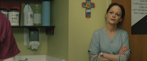 Ma è il personaggio principale quello su cui vorrei dirottaste un istante la vostra attenzione: l’infermiera tossicodipendente Mandy è infatti interpretata da Angela Bettis, la divina delle divine, svanita dalle scene per un lasso di tempo che credevo infinito e qui riapparsa, armata al solito della sua sfolgorante bravura, probabilmente pagata una miseria, e mattatrice assoluta della scena. Dio, quanto mi erano mancati il suo volto di gomma e la sua fisicità così unica. Ascoltando un’intervista a Brea Grant nel podcast Switchblade Sisters (episodio dedicato a May, una roba che per poco il mio cuore non cedeva), non sono rimasta neppure troppo stupita dall’apprendere che, con Bettis, è sempre buona la prima. Il fatto che un’attrice simile lavori così poco e faccia un film ogni tre anni, è abbastanza scandaloso, ma sono troppo felice per il suo ritorno sulle scene per lamentarmi, e quindi speriamo se non altro di riuscire a vederla un po’ più spesso in futuro.