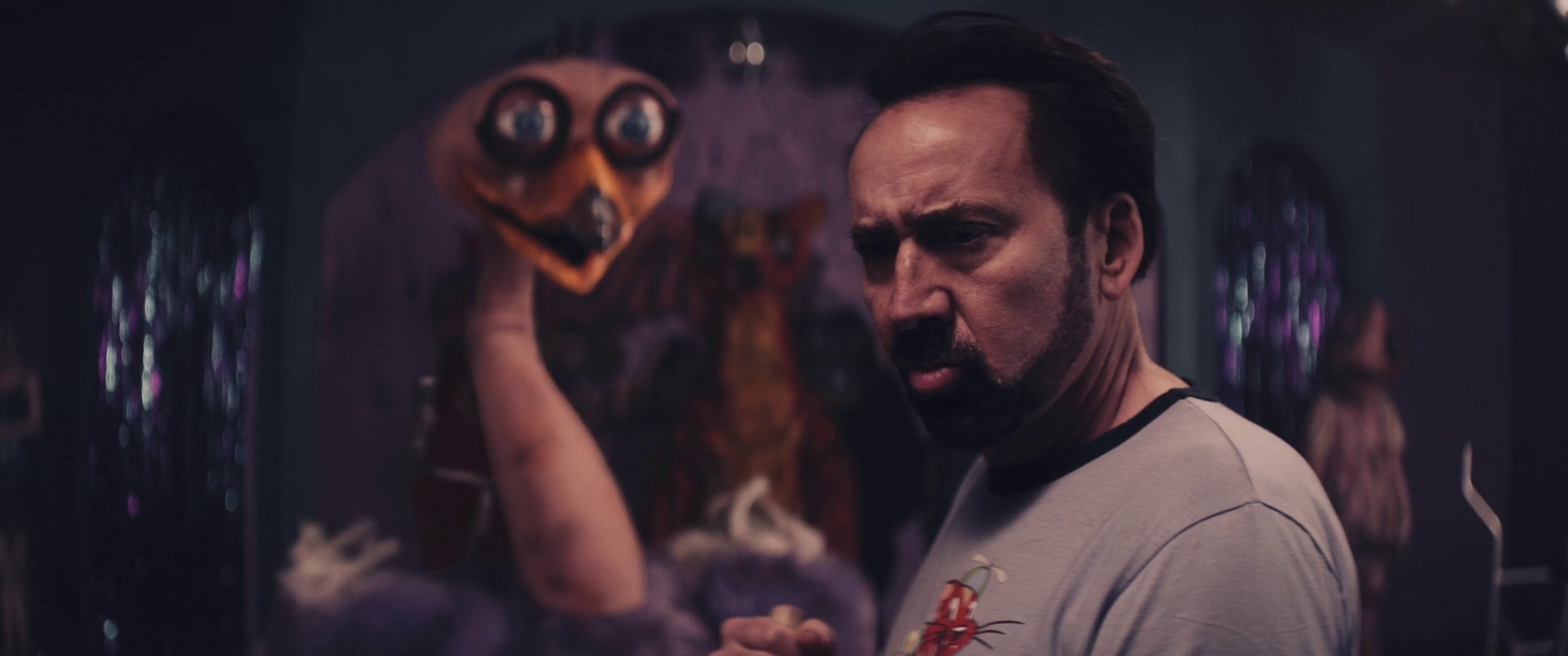 Un po’ di Five Nights at Freddy’s e, ci scommetto ogni singola fibra del mio essere, un po’ del recente The Banana Splits Movie, che usa gli animatroni per bambini come inarrestabili macchine omicide e riesce nell’impresa di trasformare un programma per l’infanzia in una ferocissima commedia splatter (mi domando per quale motivo io non ne abbia mai parlato). Ma qui il valore aggiunto è proprio Nicolas Cage e non perché si esibisca nella sua classica interpretazione tutta urla, strepiti e gestualità esasperata, ma perché fa tutto questo senza pronunciare una sola parola per tutta la durata del film, portandosi al livello successivo di ciò che, a suo parere, significa recitare. Come recitano molti banner promozionali per il film presenti in rete, trattasi di “A pure shot of Cage madness”.