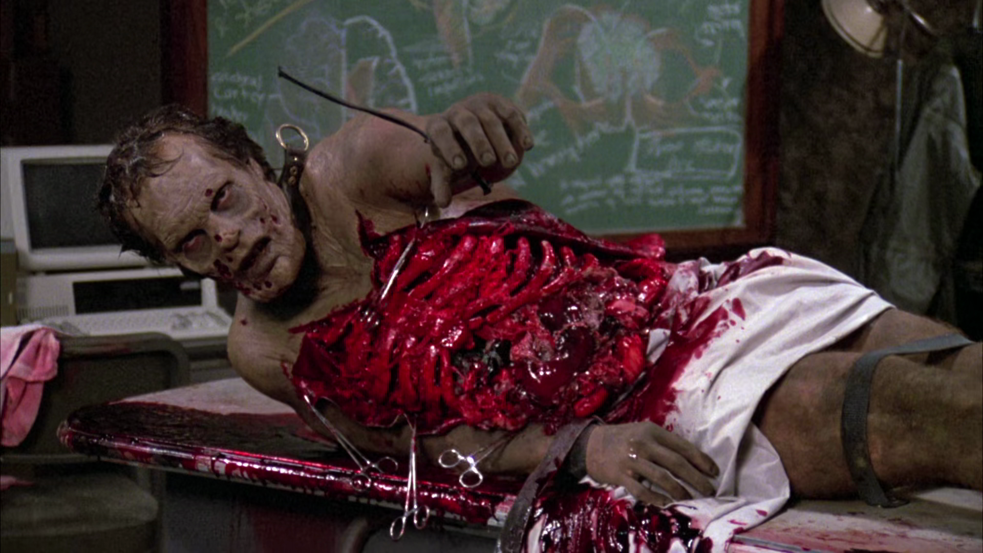 I personaggi agiscono all’interno di un apparente vuoto di potere, è vero: i militari eseguono degli ordini non meglio specificati, gli scienziati vogliono portare a termine la loro missione, ma chi li ha messi lì non ha un volto e non ha un nome. L’impressione è che, come gli zombie nel centro commerciale di Dawn of the Dead, questi personaggi procedano, da vivi, con gli stessi automatismi, rispettando dei ruoli che hanno cessato di avere un senso. Ma, se non altro, gli scienziati hanno almeno delle motivazioni forti, anche nobili, se vogliamo: persino il dottor Logan, detto dottor Frankenstein, agisce perché convinto di aver trovato l’unica soluzione possibile.
