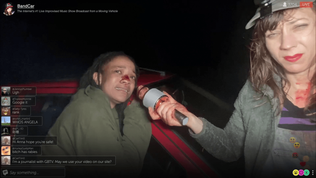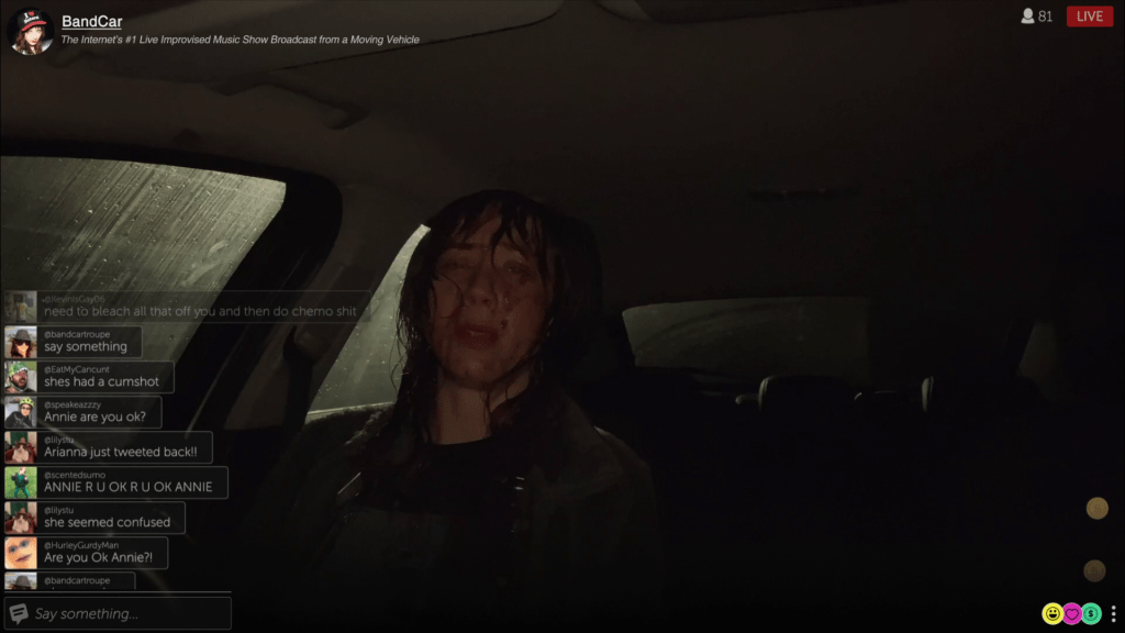 Ora, io non avrei, in linea teorica, nessun problema con una protagonista come Annie: la sua rappresentazione non è affatto simpatetica, è soltanto non filtrata, nel senso che il punto di vista è il suo, non c’è un giudizio critico da parte del regista. Mi va bene pure questo: siamo abbastanza grandi da saper giudicare per conto nostro. Però, ed è un però delle dimensioni di un continente, Annie non è interpretata da un’attrice, ma da Annie Hardy, che poi è il nome e il cognome del personaggio. Sta, di fatto, interpretando se stessa, o una versione un po’ estrema e sopra le righe di se stessa. Lo show in diretta Twitch, Band Car, che Annie conduce nel film, esiste davvero, con lo stesso titolo e le stesse modalità di esecuzione. Io Annie Hardy non sapevo nemmeno chi fosse, ma quando sono andata un po’ a documentarmi, ho cominciato a sudare freddo, perché a questo punto ho la necessità di capire che cosa il regista sta combinando. Hardy è innanzitutto una cantante, non so se così di estrema destra come appare nel film, ma di certo molto spostata da quella parte. Sicuramente è una no-vax di quelle oltranziste, e non fatico a credere che sia pure la piattola insopportabile che ci dobbiamo sciroppare in Dashcam.