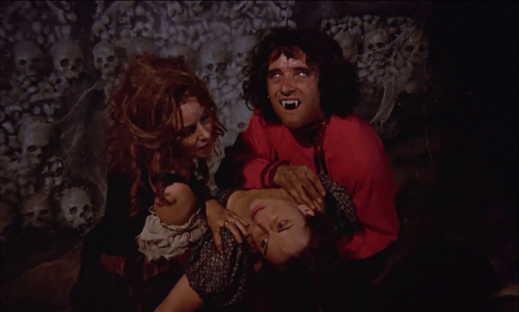 La seduzione degli abitanti del villaggio da parte dei vampiri circensi ci appare quindi assolutamente naturale: hanno sedotto anche noi. Nulla mi toglierà mai dalla testa che Mike Flanagan, quando ha dovuto mettere in scena il clan di Rose Hat, ha pensato molto a questo film tutto sbilenco della Hammer, soprattutto per quanto riguarda la coesione interna al gruppo di vampiri, il loro muoversi e agire come una cosa sola, in aperta opposizione con la natura litigiosa e individualista fino all’autolesionismo dei poveri residenti di Stetl, subito sedotti dallo spettacolo, ammaliati da un modo di vivere così alieno e, allo stesso tempo, irresistibile. Presenziare agli spettacoli serali del circo diventa quasi una droga, in particolare per le giovani donne del villaggio, tutte innamorate perse del bellissimo vampiro Emil che all’occorrenza si trasforma in una pantera nera, e qui sfoggia un grande look alla Roger Daltrey.