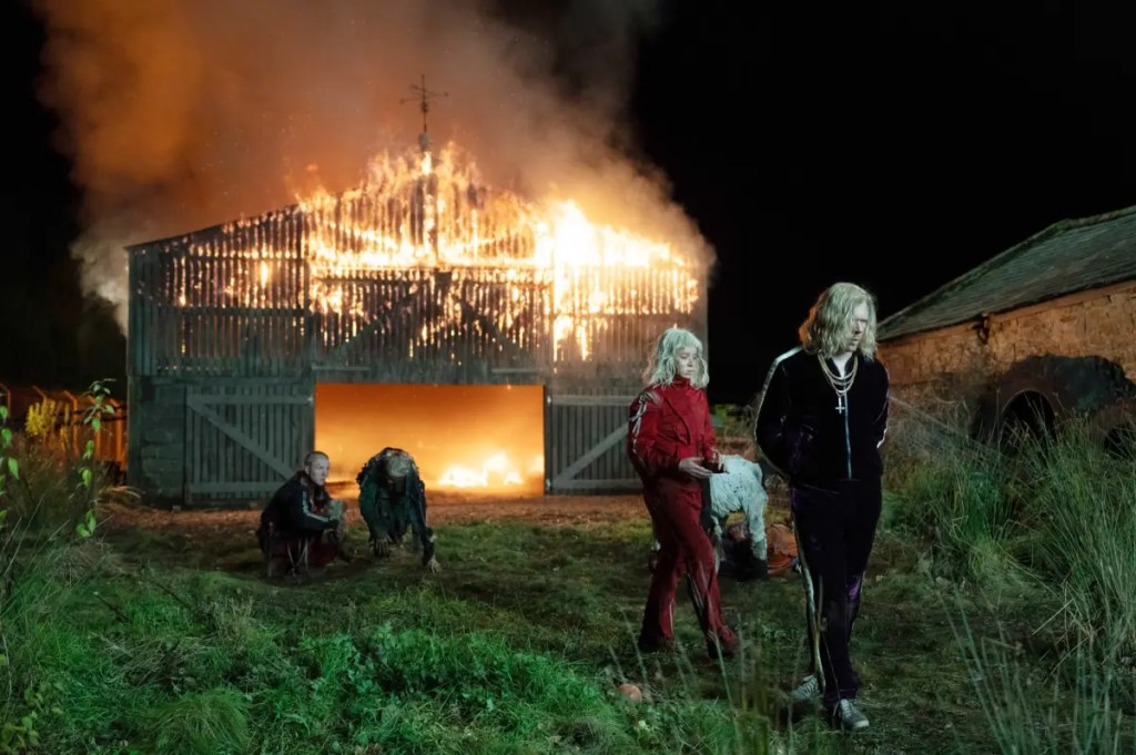 Da un punto di vista tonale, Il Tempio delle Ossa procede in scia con il finale di 28 Anni Dopo. Sì, proprio quella manciata di minuti così bizzarra e, all’apparenza fuori posto che tanto aveva fatto discutere l’anno scorso. Il viaggio iniziatico del giovane Spike (Alfie Williams) prosegue dopo aver incontrato il gruppo di buffi personaggi con la parrucca bionda, guidati da Lord Jimmy Crystal (Jack O’Connell). Trattasi di una piccola congrega di satanisti, convinti che l’epidemia che ha distrutto la Gran Bretagna sia dovuta all’intervento del demonio sulla terra. Il vecchio caprone, lo chiama Jimmy, affermando di essere suo figlio. Spike viene incluso nella mini setta, suo malgrado, e segue Jimmy e le sue “dita”, attraverso il paesaggio rurale punteggiato da comunità isolate.