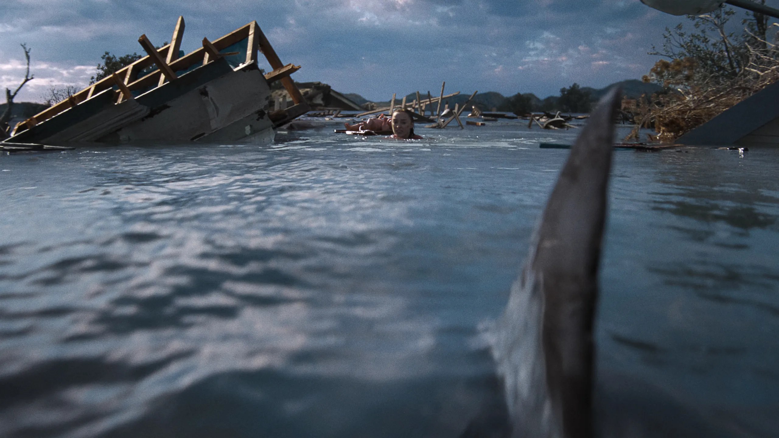 Thrash è anche un film corale. Non si concentra su un paio di personaggi bloccati in un interno, ma ci presenta un variegato spaccato di umanità alle prese con uragani e predatori: c’è la giovane Dakota (Whitney Peak), che non riesce a lasciare il suo appartamento perché agorafobica; c’è Lisa (Phoebe Dynevor), quasi al termine della sua gravidanza, mollata da poco dal fidanzato, e costretta ad andare a lavorare anche in mezzo all’uragano; ci sono tre fratelli affidati a una famiglia di stronzi, a cui tocca la parte del film che più somiglia a Crawl, quella con gli squali che ti vengono a sguazzare in salotto; c’è, per ultimo ma non meno importante, lo zio Dale (il magnifico Djimon Hounsou), biologo marino esperto di squali che deve arrivare ad Annieville per salvare sua nipote Dakota e per seguire gli spostamenti della squala bianca incinta Nellie (amore di zia). Insomma, Wirkola segue lo schema del film catastrofico classico, quello rimasto invariato dagli anni ’70, e che continua a funzionare, se ben gestito.